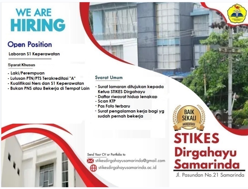 STIKES Dirgahayu Samarinda membuka kesempatan bagi tenaga profesional untuk bergabung sebagai Laboran Program Studi S1 Keperawatan.